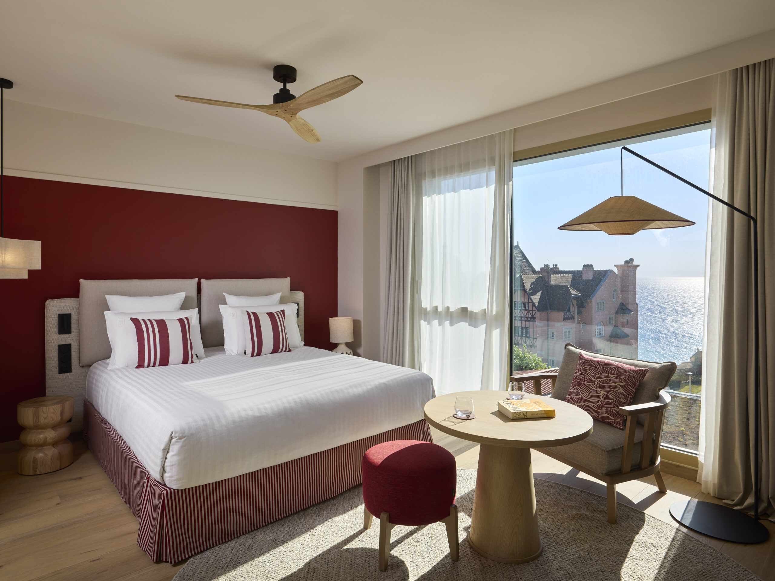 Les chambres de l’hôtel vous accueillent dans un cadre lumineux et spacieux, offrant une vue imprenable sur la mer. La palette chromatique choisie, où se mêlent subtilement des nuances de blanc et de rouge basque, apporte une touche locale à la décoration intérieure. Pour un confort optimal, les têtes de lit sont conçues comme de grands coussins informels, invitant à la détente et à la convivialité.