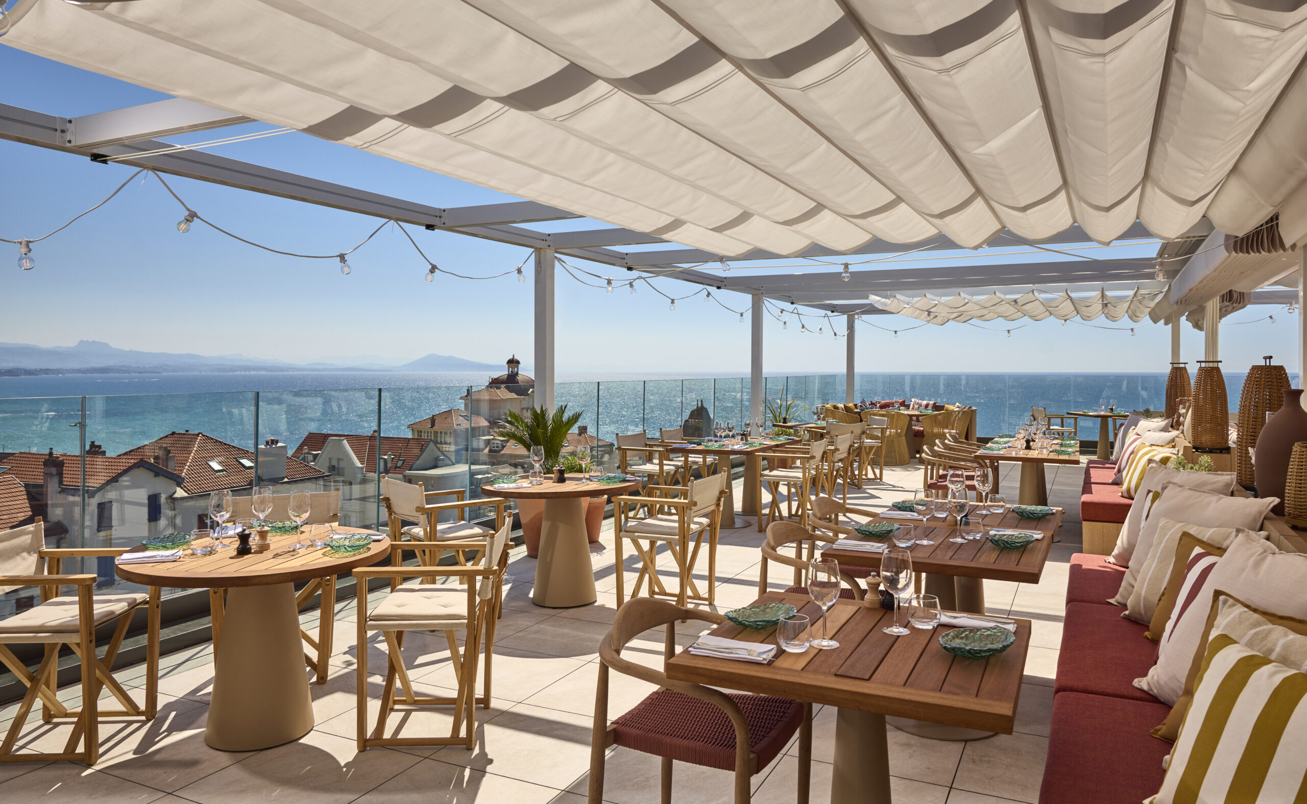 Le dernier étage constitue un véritable lieu de vie. Il accueille le bar, le restaurant intérieur, la piscine et un large espace extérieur lounge/bar/restaurant. Talaia : le nom de l’hôtel qui signifie « tour de guet » prend ici toute sa signification ; le restaurant suspendu dans le ciel devient un véritable belvédère sur Biarritz, conjuguant ciel, mer et montagne. Pour se faire, le restaurant est largement vitré. A l’intérieur, on retrouve l’esprit bord de plage, canisses au plafond et le sable au sol participent à créer l’atmosphère.