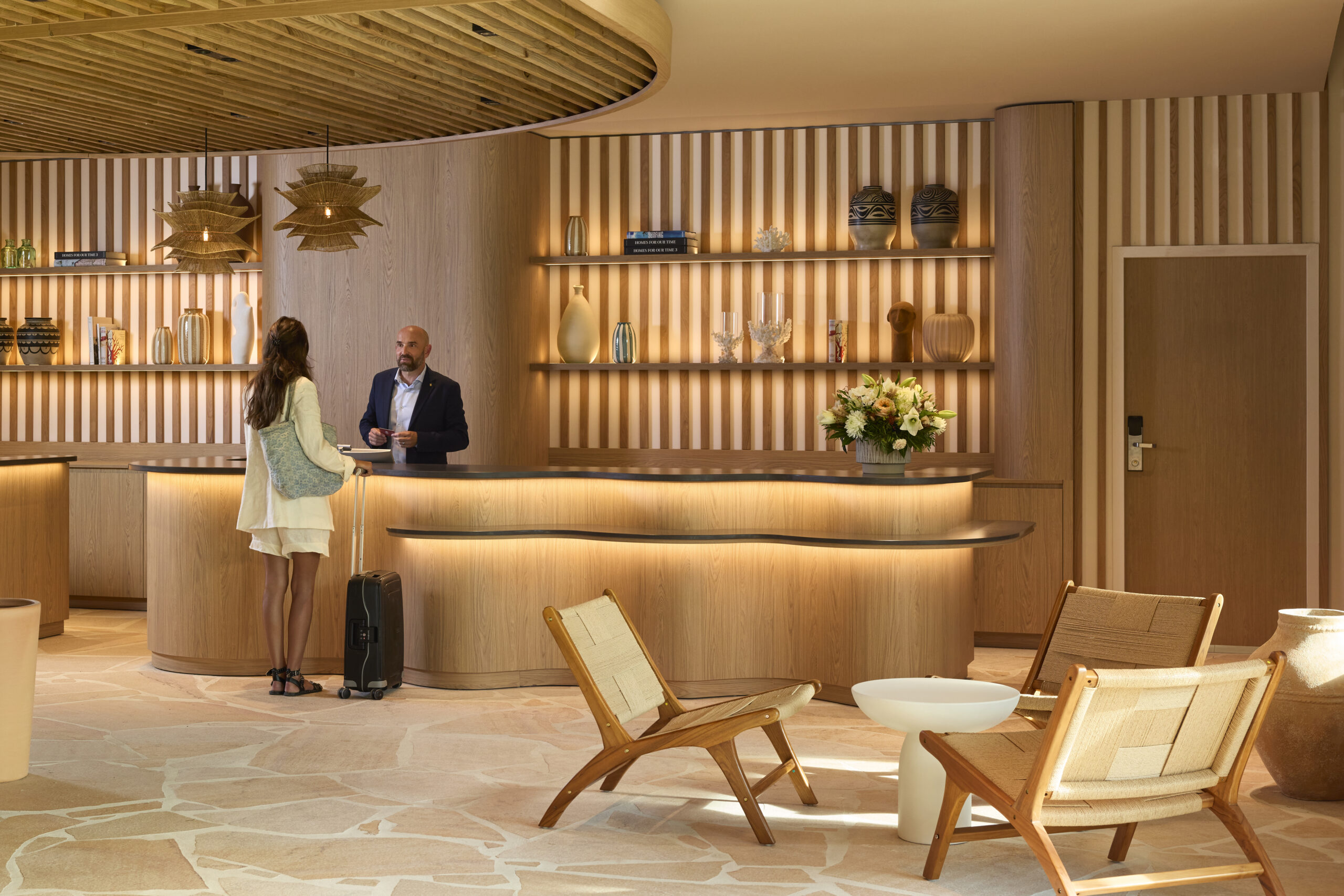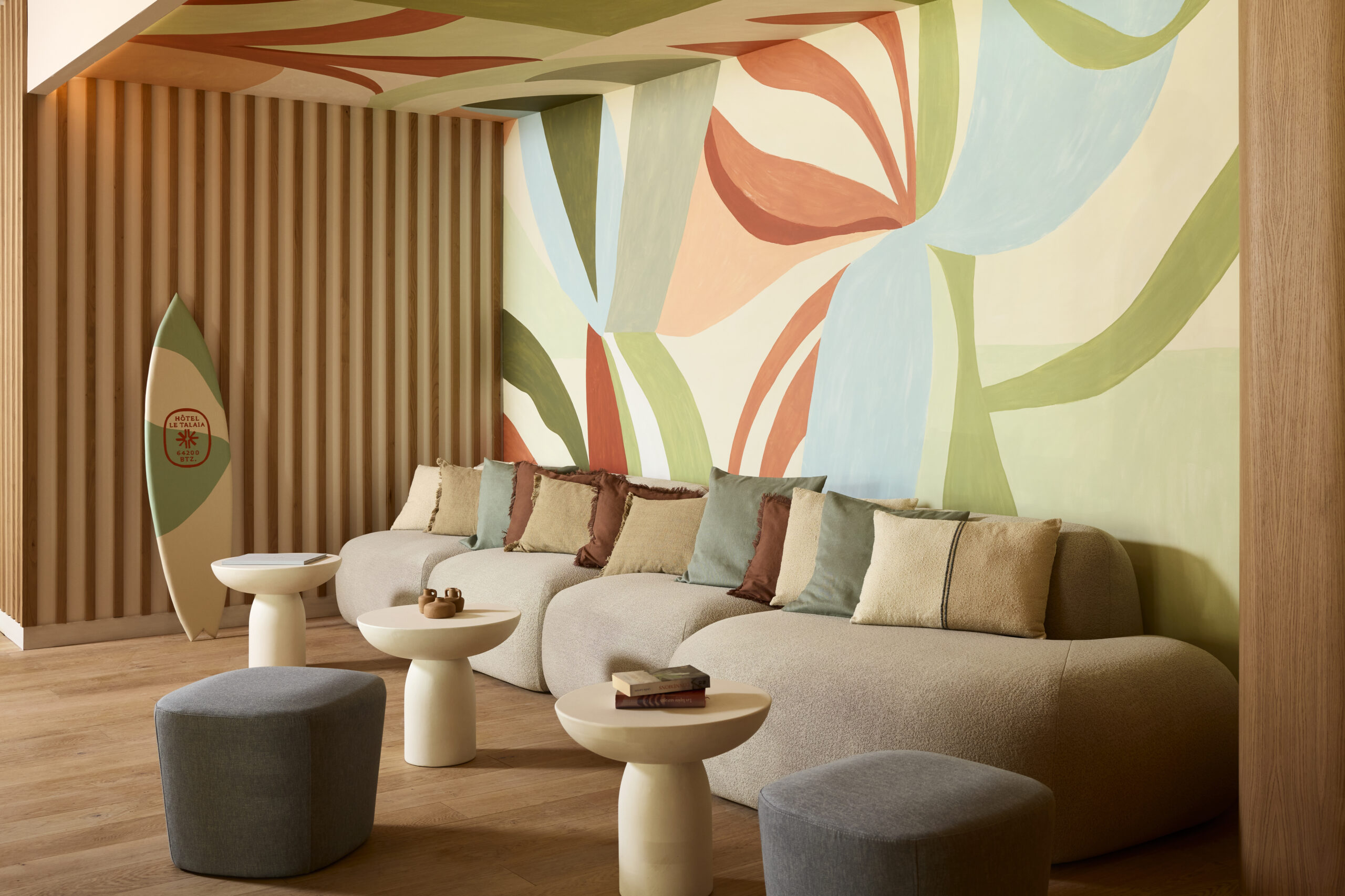 Dès l’entrée, l’hôtel affirme sa personnalité : un espace d’accueil vivant, fluide et multifonctionnel, pensé comme un lieu de rencontre et d’échange. Ici, le pro shop de surf côtoie un bar qui fait également office d’espace informel de réunion ou d’attente. Au sol, une pierre posée en opus évoque les falaises et les sentiers côtiers ; aux murs, des lattis de bois naturel rappellent les cabanes de plage et les forêts de pins du littoral. En toile de fond, une grande fresque contemporaine incarne l’esprit du lieu : un hommage artistique à la mer, au mouvement et à la culture basque.
